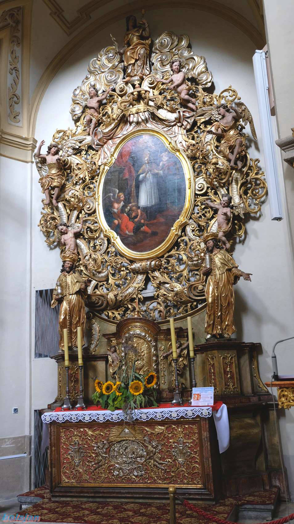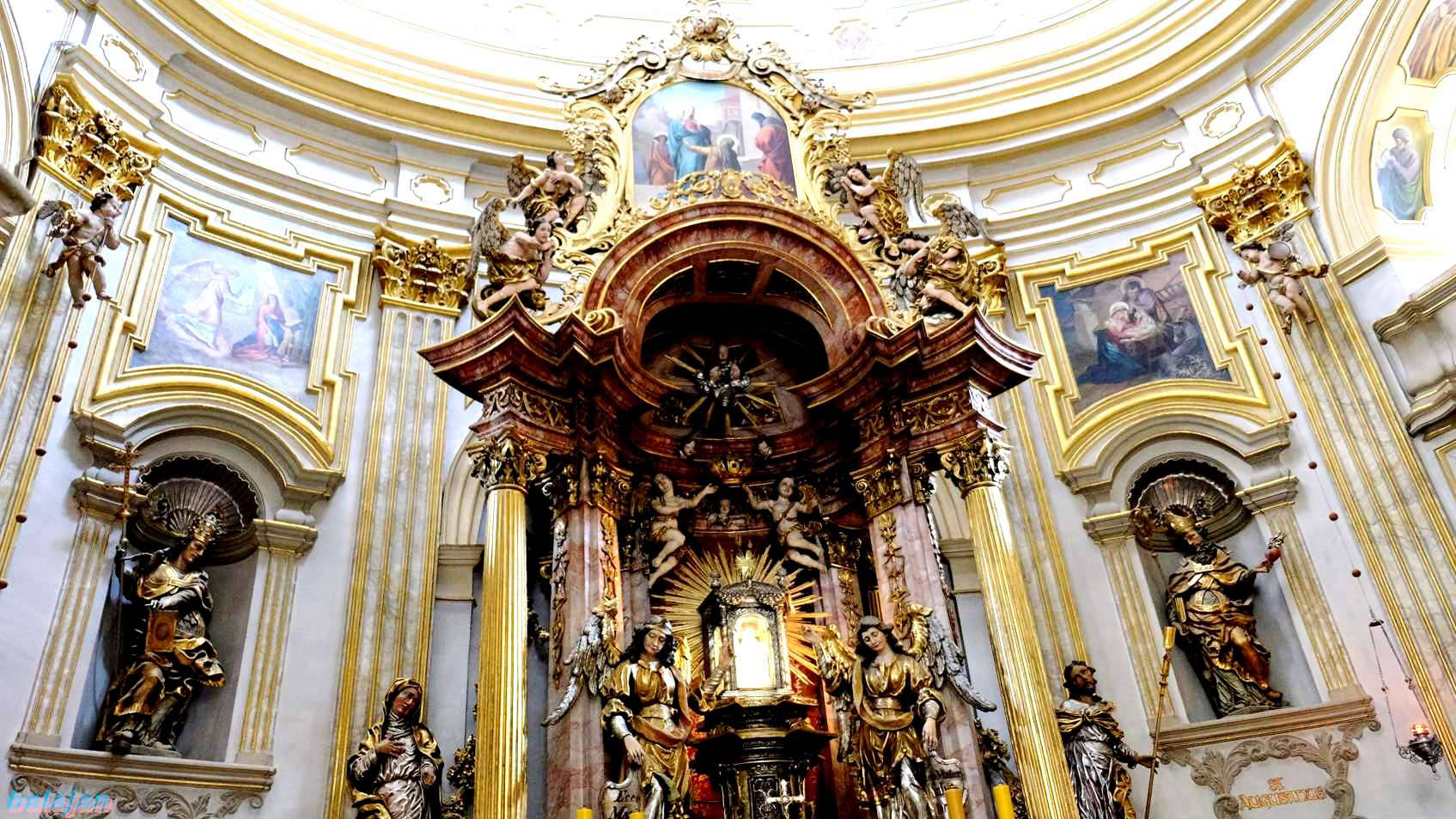Wnętrze świątyni utrzymane w duchu baroku zdobią malowidła, obrazy i rzeźby, spośród których na szczególną uwagę zasługują dzieła Karola Sebastiana Flackera: ambona, będąca rzeźbiarską kompozycją wyrażającą słowa maryjnego hymnu Magnificat i ołtarz główny mieszczący cudowną figurkę Matki Boskiej . Figurka wraz z cokolikiem wykonana jest z lipowego drewna w stylu gotyckim, ma 28 cm wysokości . Przedstawia ona Matkę Bożą z nagim Jezusem na ręku. Dzieciątko w prawej ręce trzyma ptaszka, a lewą sięga po owoc, umieszczony w lewej dłoni Matki. Głowy Maryi i Jezusa ozdobione są koronami. Cała figurka jest polichromowana. Podobnie jak inne tego typu wizerunki, wambierzycka figurka ubierana jest w tzw. „sukienkę”, która okrywa ją całą od szyi w dół. Sukienek jest kilka w różnych kolorach, zależnie od święta lub okresu roku liturgicznego.