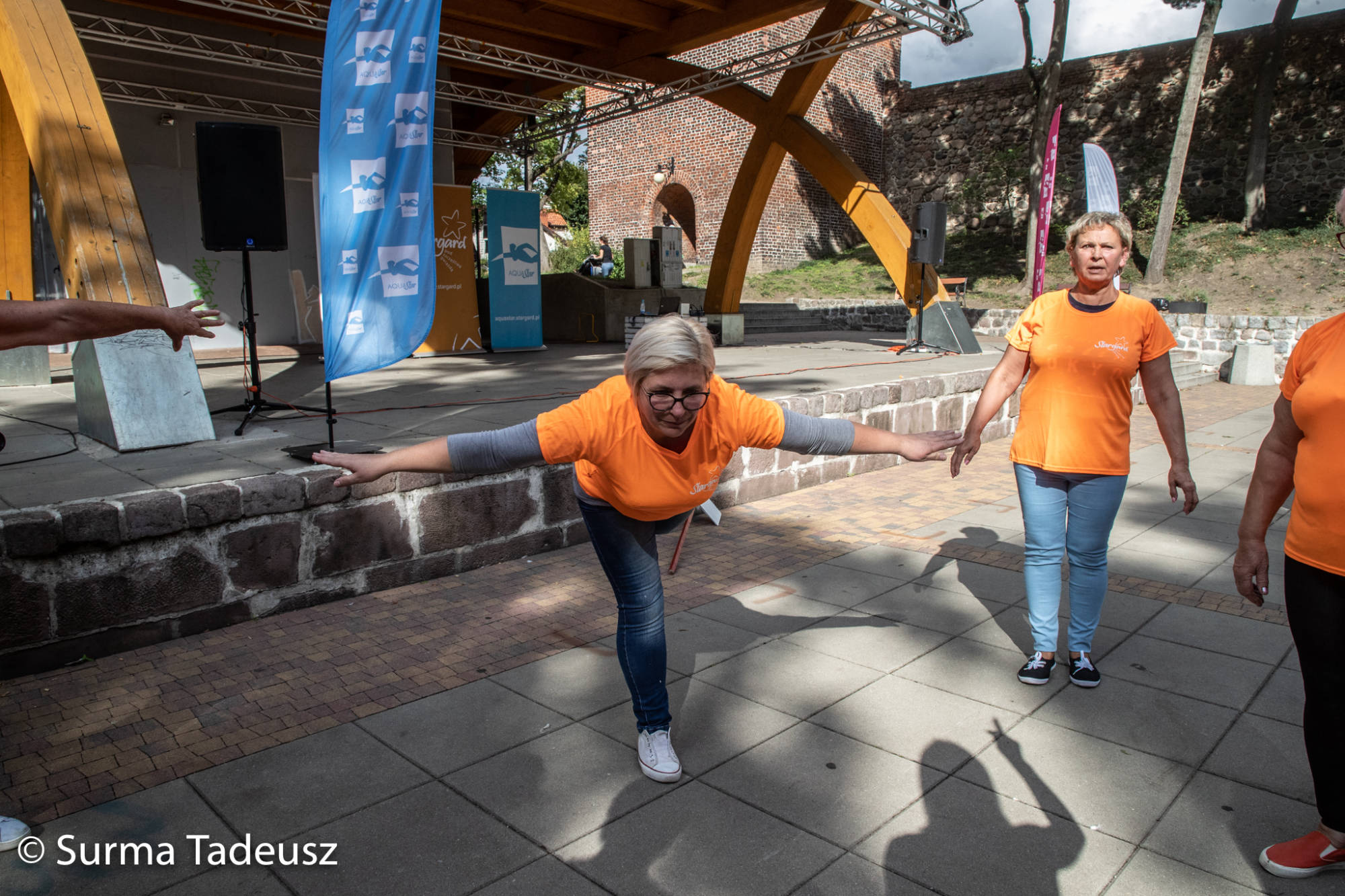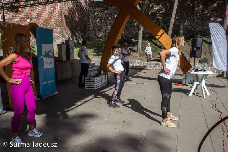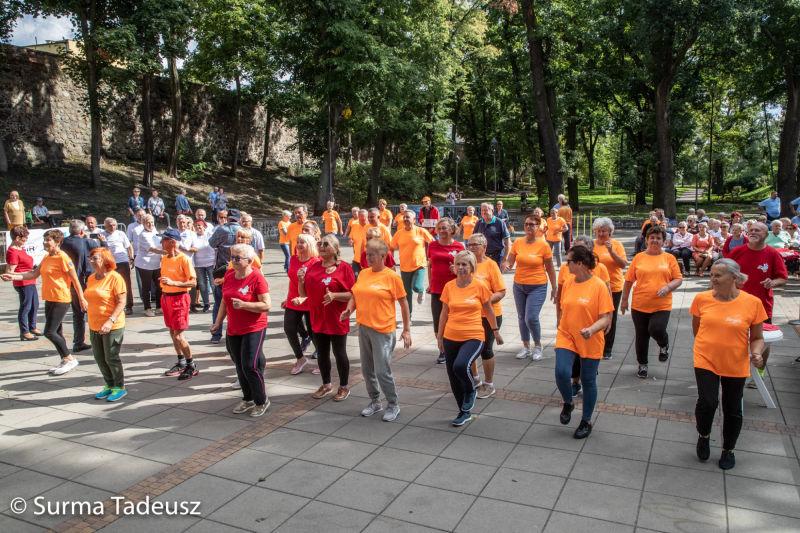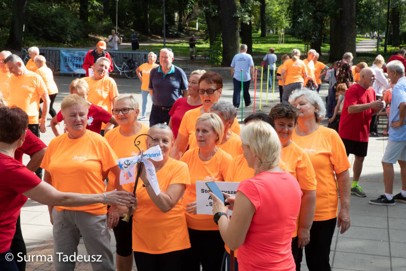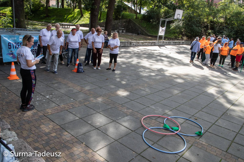 Później, po krótkiej rozgrzewce poprowadzonej przez instruktorki Ośrodka Sportu i Rekreacji Stargard, seniorzy bawili się w Teatrze Letnim. Tam czekały na nich różne konkurencje sportowe. Łącznie było ich 9. Stargardzianie m.in. rzucali piłką do kosza, celowali do bramki, przechodzili pod taśmą, dmuchali balony, robili jaskółkę. Nad przebiegiem zawodów czuwali pracownicy OSiR.